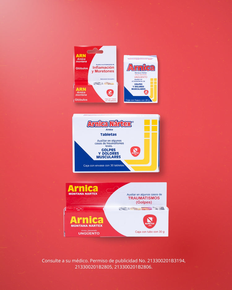 Arnica Nártex® es una línea de medicamentos homeopáticos elaborados con árnica, tradicionalmente utilizada como auxiliar en el alivio de golpes, moretones, inflamación y dolor muscular.